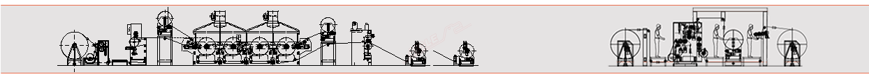 MOVING UNWINDER, auf Rädern montiert und auf Schienen laufend. Sie kann vor dem ersten Heizzylinder und dem abgewickelten Material, das kaschiert werden soll, oder nach dem zweiten Heizzylinder platziert werden und fungiert somit als „Dry-Coat“-Einheit
