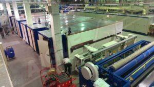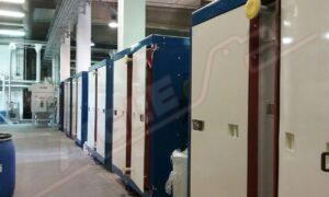 – Cuadro eléctrico y PLC; los componentes del motor están agrupados en cuadros de control modulares. Las funciones principales aparecen en la pantalla. La sincronización con el resto de la línea se realiza mediante motores de corriente alterna controlados por un inversor con función vectorial. La sincronización general del sistema se obtiene mediante una señal de entrada a las fichas encargadas del control de los inversores. El ajuste general de la velocidad se efectúa mediante el potenciómetro del motor y el amplificador de señal. Las placas electrónicas que regulan los inversores también están equipadas con potenciómetros (corregidos en porcentaje).