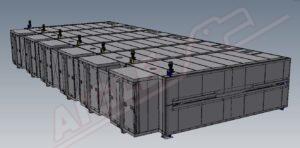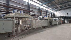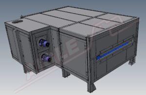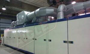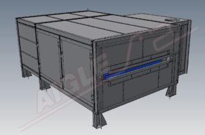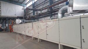 – Sistema de calefacción; equipado con un ventilador de circulación, una batería, sopladores relacionados con el aceite, recuperación de canales y un filtro. Para garantizar un calentamiento y una distribución del aire uniformes, los campos son opuestos derecha/izquierda. Para reducir el consumo de energía eléctrica durante la fase de alta temperatura del horno, todos los ventiladores de recirculación se controlan con un inversor que regula la velocidad en función del aumento de la temperatura.