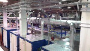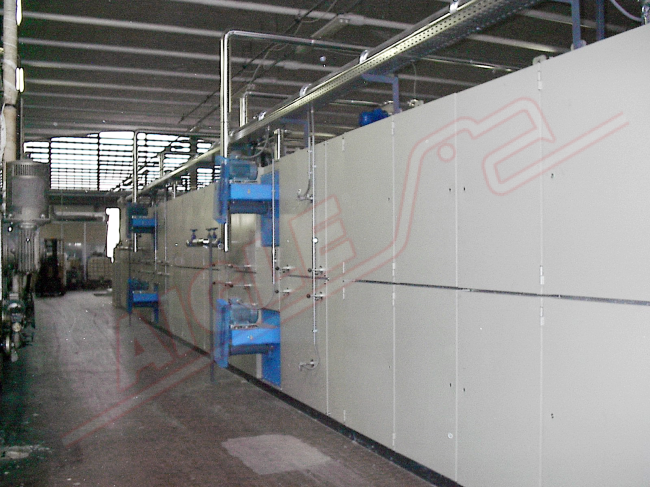 – Sistema de escape de aire; compuesto por tubos de escape situados en la parte superior del horno, conectados con dos canales de aire situados en el exterior del horno a lo largo de los laterales superiores. Para cada campo, se prevén aberturas variables con el fin de obtener un ajuste perfecto de la cantidad de aire aspirado localmente. El rame consta de un sistema de cadena vertical con pernos equipados con lubricación automática. El campo divergente está controlado por dos motores de corriente alterna independientes, equipados con inversores y activados por dos sensores. Dos pares de cepillos giratorios enganchan neumáticamente el tejido y lo hacen avanzar. La tensión correcta de la cadena del rame se controla automáticamente mediante un sistema neumático. Los raíles de la rame están divididos en secciones, una para cada campo. Cada sección está montada sobre un eje transversal roscado motorizado que permite variar la anchura del rame. La anchura de cada campo se controla mediante codificadores con PLC y se muestra en la pantalla mediante el diagrama.