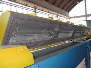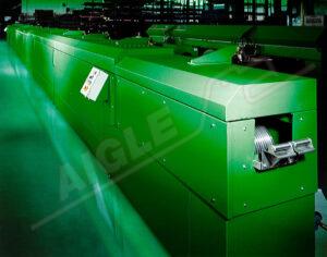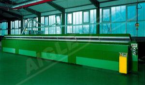 Le Four de séchage à air chaud mod. FAC12/G est divisé en quatre travées de trois mètres chacune et chauffe les profilés à l’air chaud. L’air est chauffé par des brûleurs à gaz modulés, puis propulsé par une turbine.