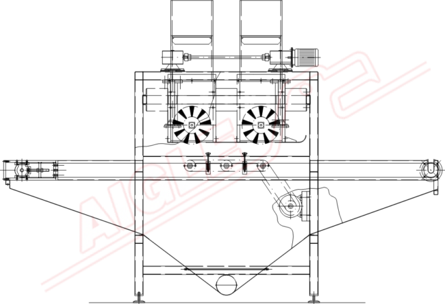 – Une lame aspirante sur le tapis roulant (en option) et un collecteur de flocons sous les trémies, reliés à un ventilateur équipé de filtres à manches et d’un sac de récupération des flocons.