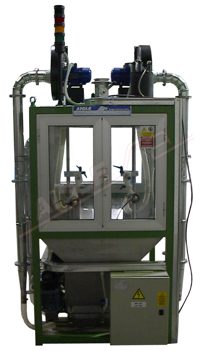 – Gruppo di dosaggio/contenimento: consiste in uno speciale contenitore di flock situato nella parte inferiore della macchina, alla cui base vi sono due spazzole con variatore di velocità, le quali inviano flock ai miscelatori flock/aria in maniera costante e regolabile. Un dispositivo rompi-ponte all’interno del contenitore previene la formazione di “ponti” nel flock. La miscelazione aria/flock si ottiene tramite uno speciale ventilatore e il trasporto del flock ai due gruppi di spruzzatura situati nella parte superiore della macchina è effettuato tramite tubi flessibili.