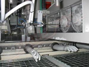 AIGLE inserisce così la floccatrice e la cabina di pulizia finale all’interno di impianti già esistenti per la produzione di guanti in lattice. Questo comporta una personalizzazione delle macchine per l’adattamento agli impianti in uso o in progettazione. L’impianto di floccaggio viene attrezzato con tramogge e/o pistole elettropneumatiche per una adeguata distribuzione del flock. La floccatrice è poi dotata di un sistema di raccolta e ricircolo del flock in eccesso tramite collettori collegati ad impianti di aspirazione.